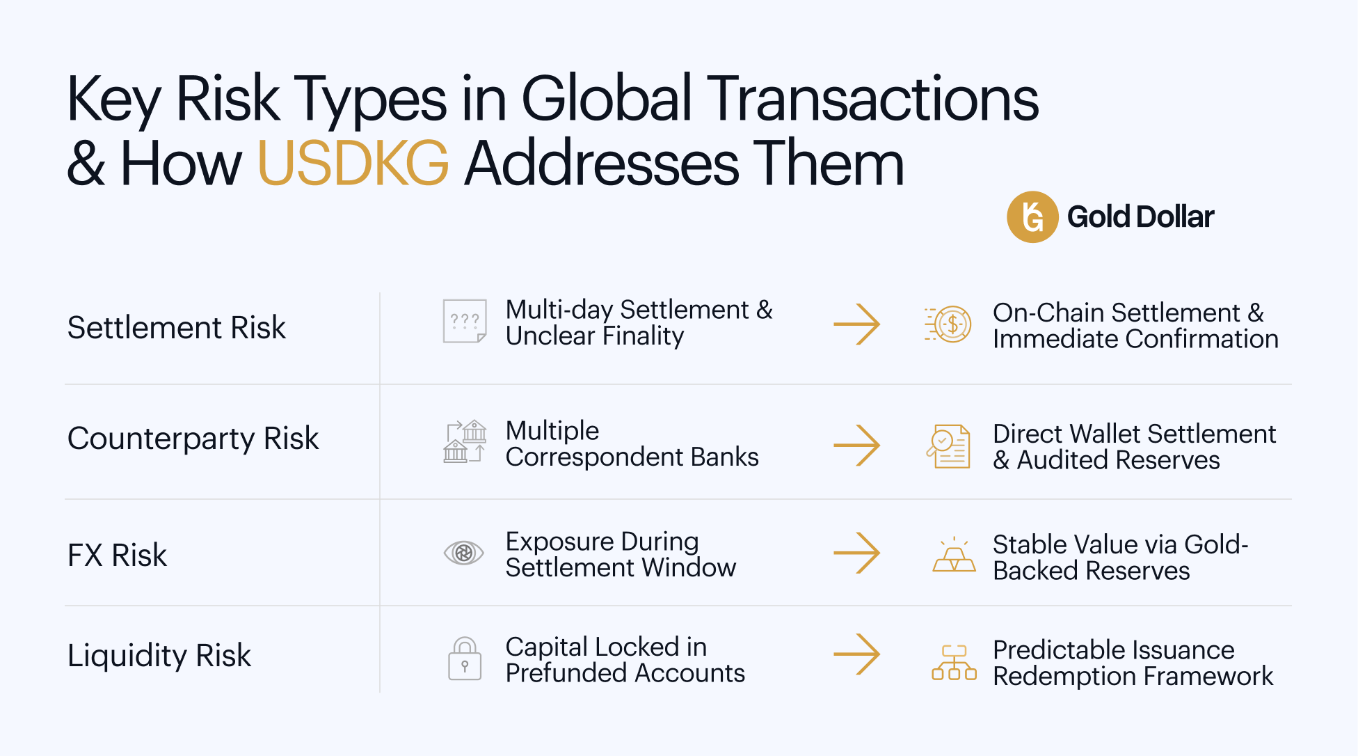 USDKG reduces counterparty risk by anchoring value transfer to a verifiable asset base rather than relying solely on institutional credit relationships. Settlement occurs directly between digital wallets on-chain, while issuance and redemption remain governed by audited reserves and regulated oversight. This separation between settlement execution and reserve custody reduces reliance on intermediary solvency during the transaction process.