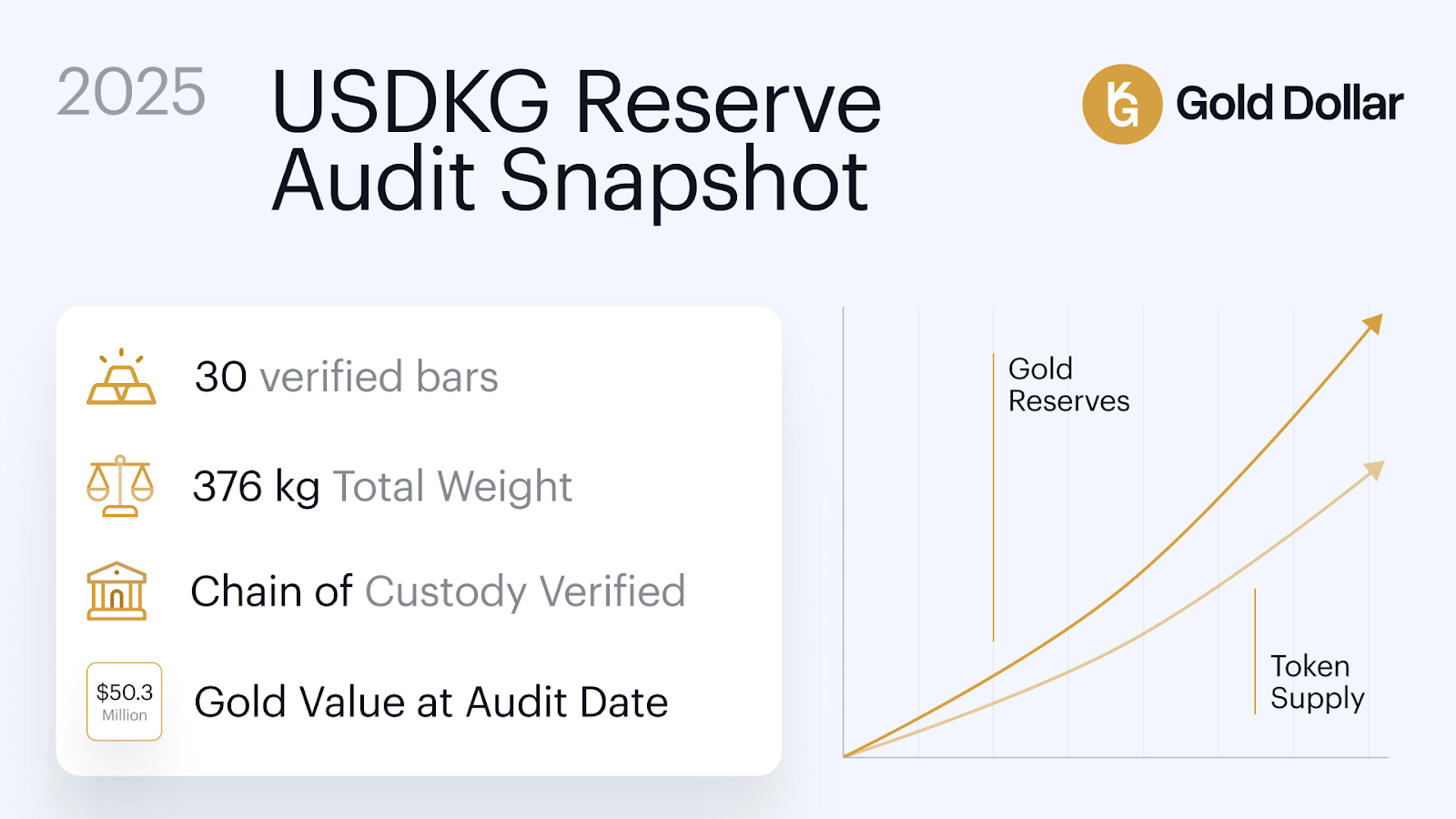 At the time of issuance, USDKG was backed by 30 gold bars with a total weight of approximately 376 kilograms. Using LBMA pricing, these reserves were valued at approximately USD 50.3 million, exceeding the registered issuance amount. This overcollateralization provides an additional layer of security for token holders.