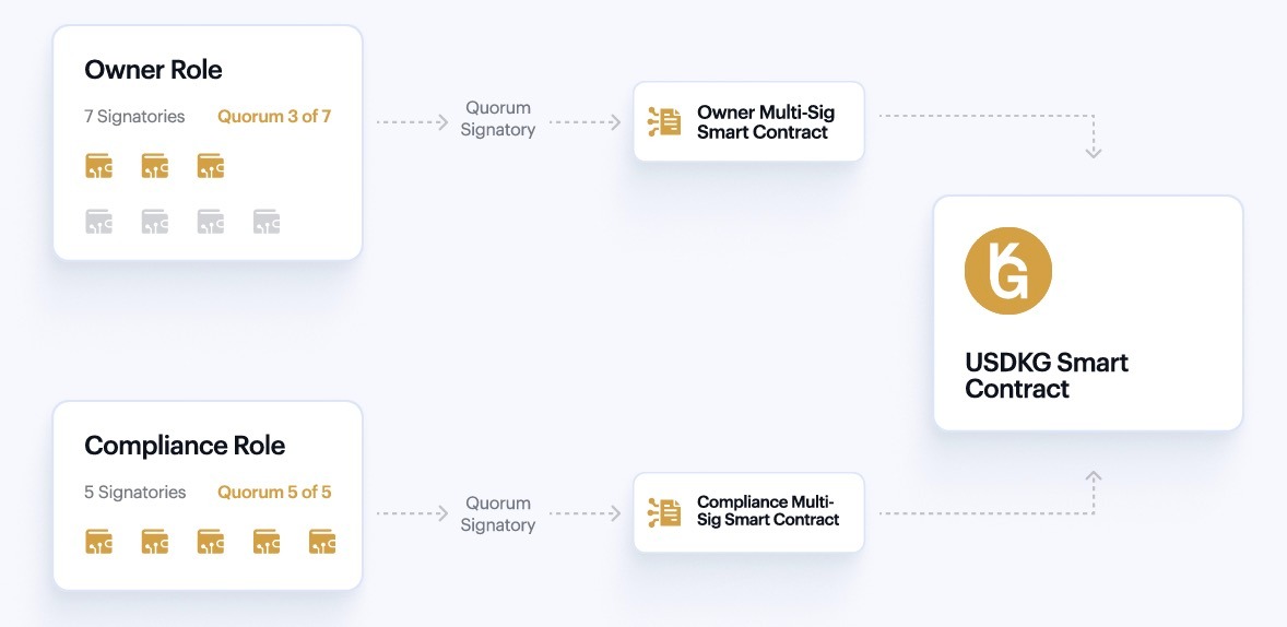 USDKG's smart contracts are governed through a multi-signature structure that separates operational authority from compliance functions. Mint and burn operations require approval from a defined quorum, while compliance-related controls are managed through a separate multi-signature arrangement. This approach enhances smart contract security and reduces systemic risk.