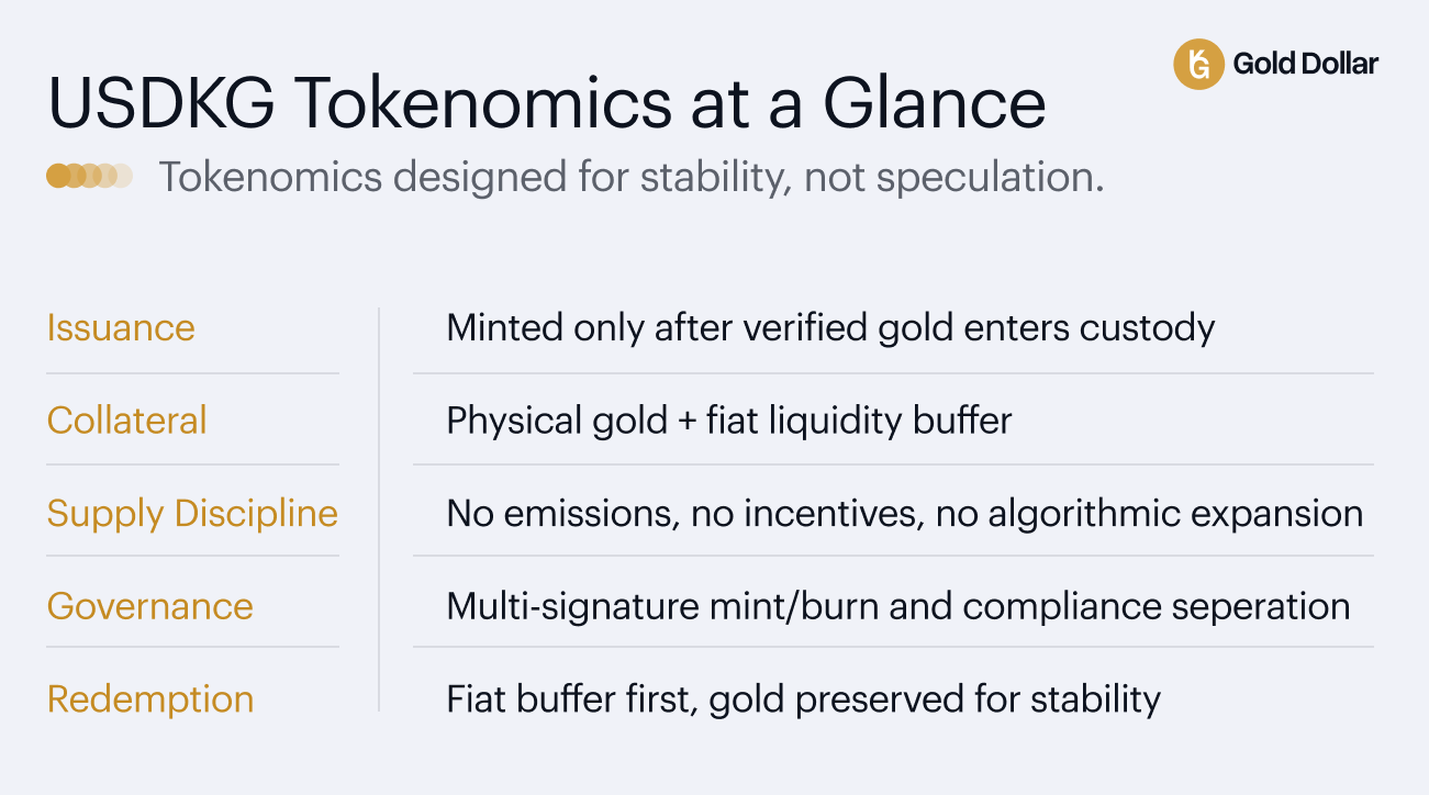 USDKG, a gold-backed stablecoin, was not designed to reward activity, bootstrap liquidity through incentives, or create reflexive growth loops. Its tokenomics are built around a different objective: maintaining price stability through disciplined issuance, verified collateral, and predictable redemption. Understanding USDKG's tokenomics therefore requires shifting perspective from incentive engineering to balance-sheet mechanics, with a focus on regulatory compliance and a robust legal framework.